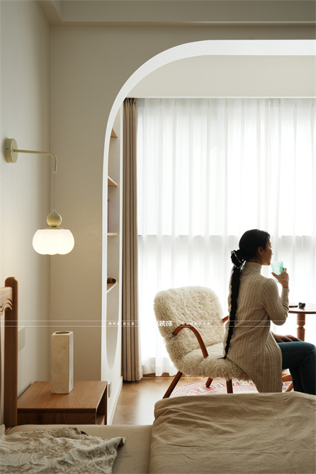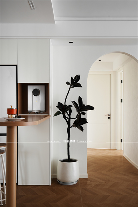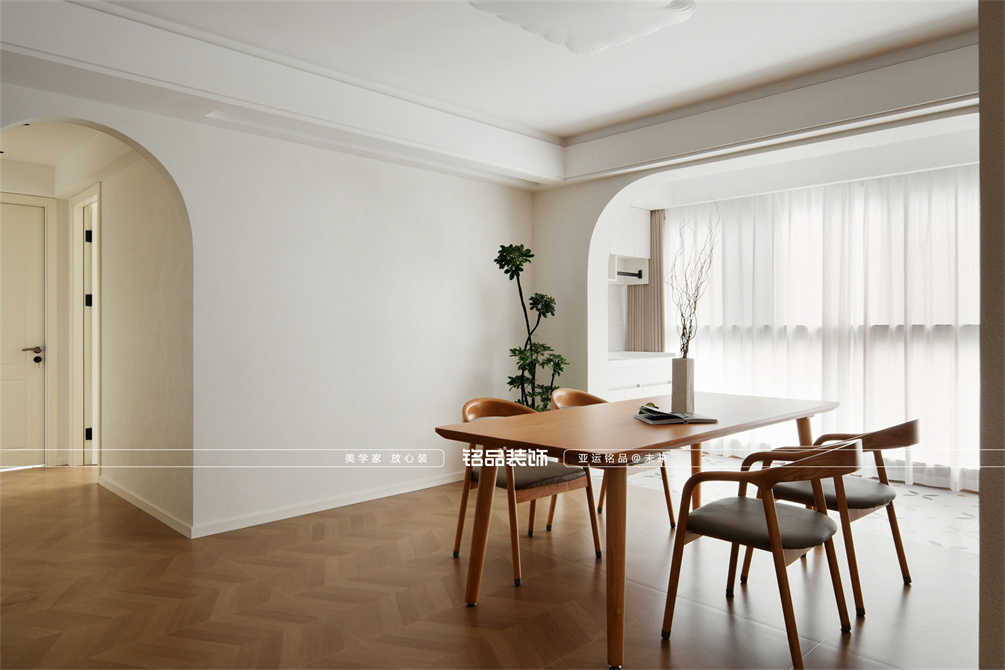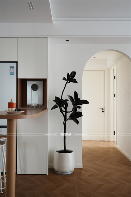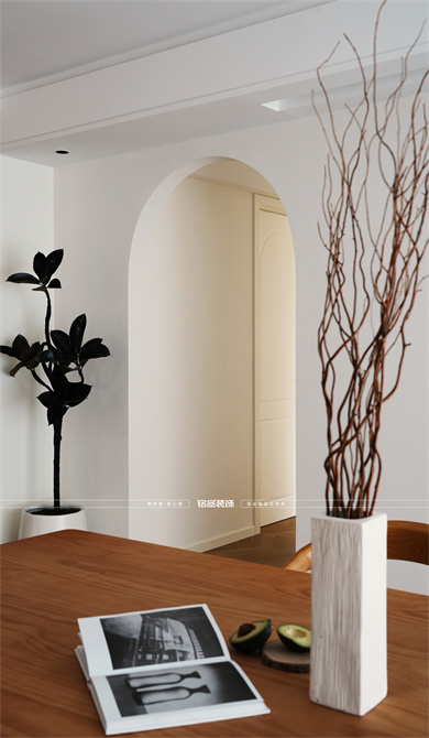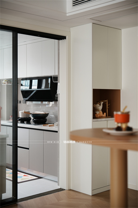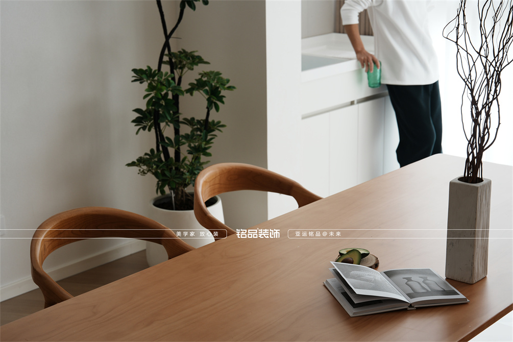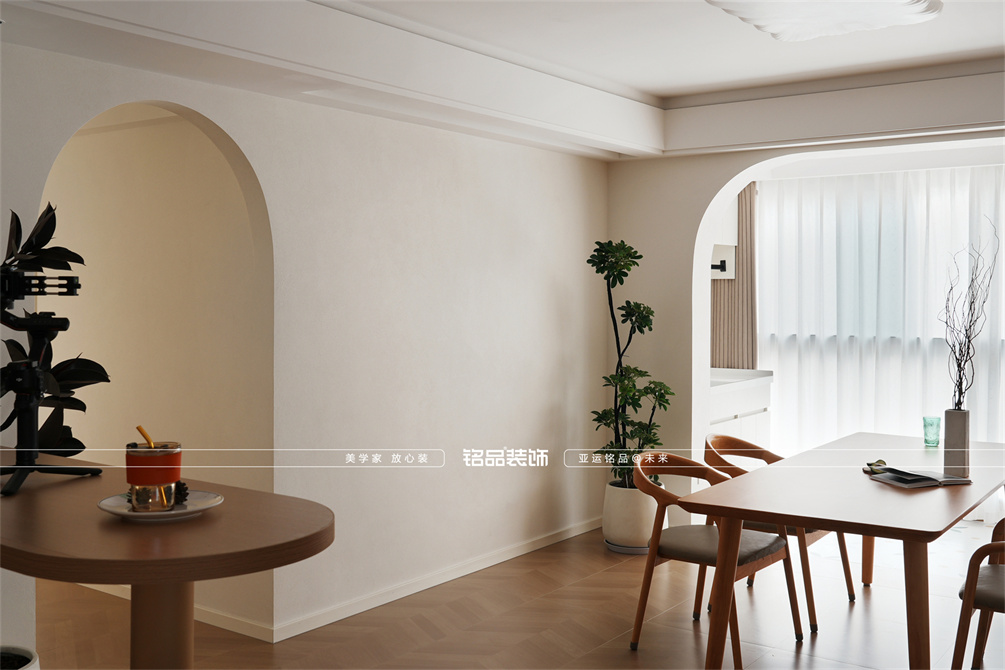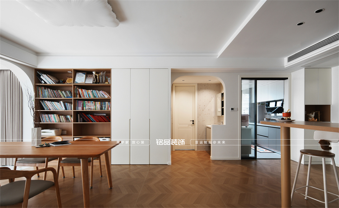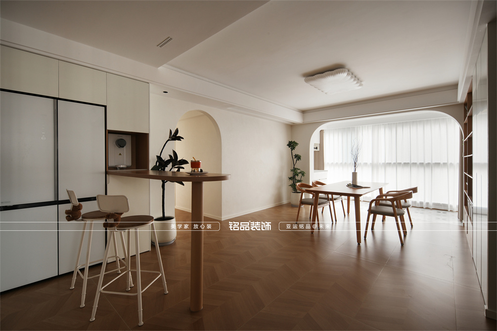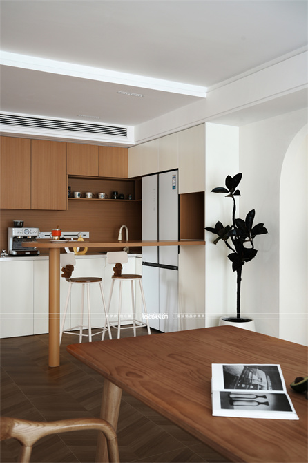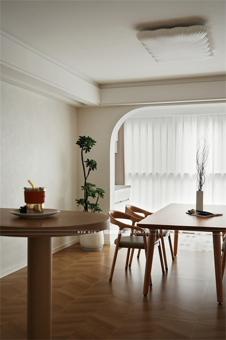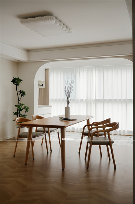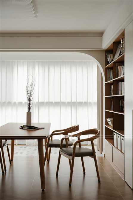 本案以奶油原木风为基调,采用去客厅化的设计,打破传统客厅布局的全新设计理念,重新塑造空间的功能与价值。它摒弃了以电视、沙发、茶几为核心的固定模式,转换成以居住者的实际需求为核心,将客餐厅打造成家庭活动的核心区域,成为一个多功能、灵活且个性化的生活空间,增加了家庭成员之间的互动性,促进沟通与交流,同时兼具了美观性与实用性,通过嵌入式柜体,不同组合的开放式与隐藏式收纳,最大化利用空间,提升空间利用率。这种个性化的设计表达出了业主开朗随和的性格,体现业主积极向上的人生态度和生活方式。
