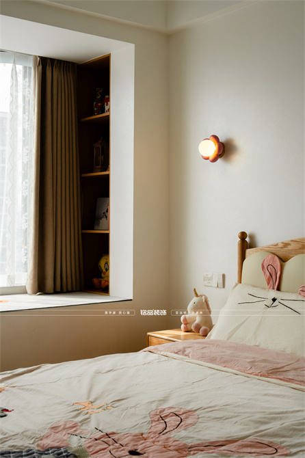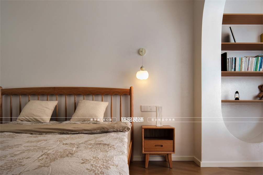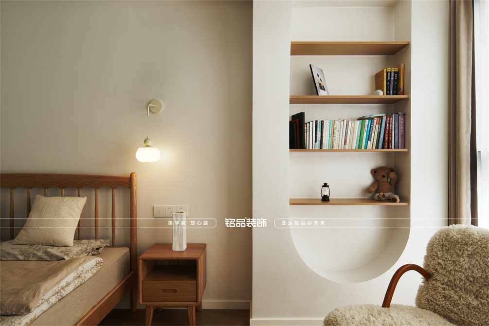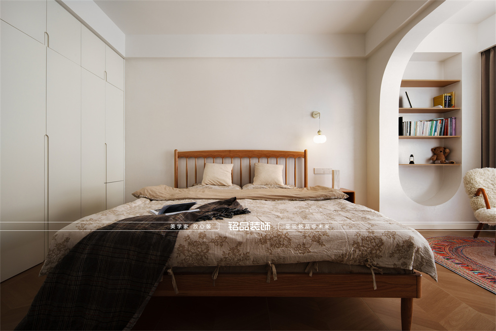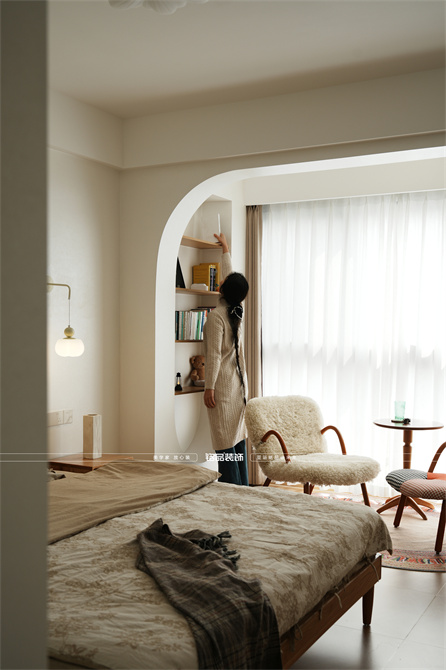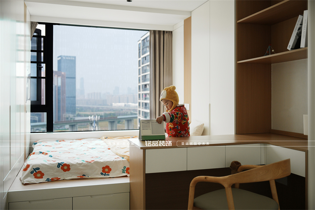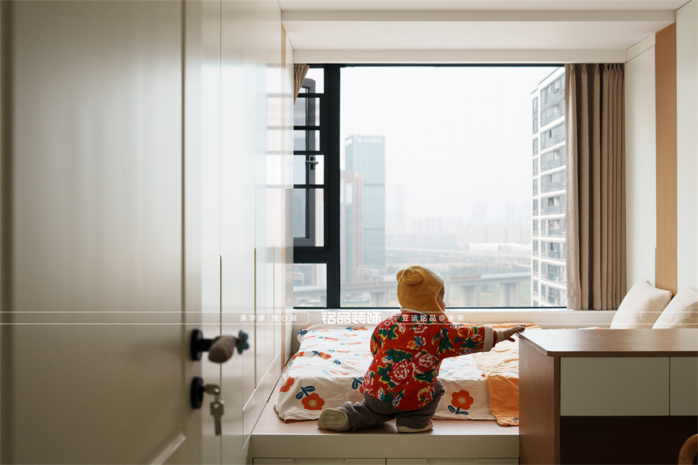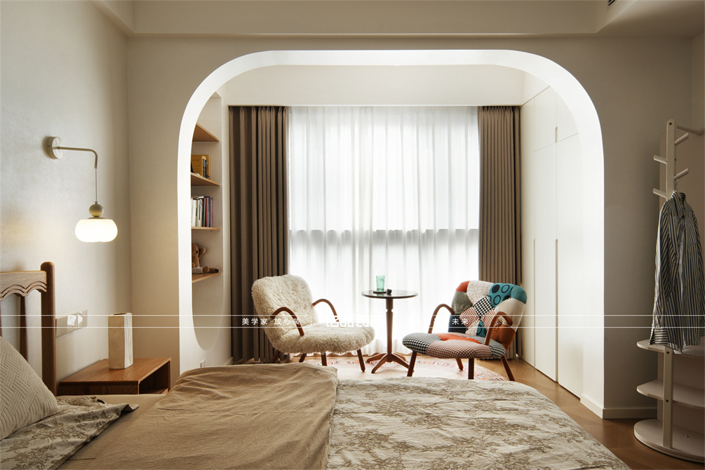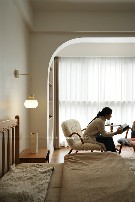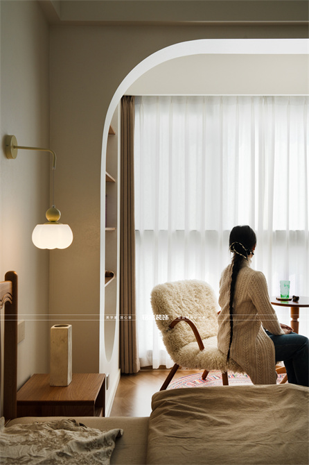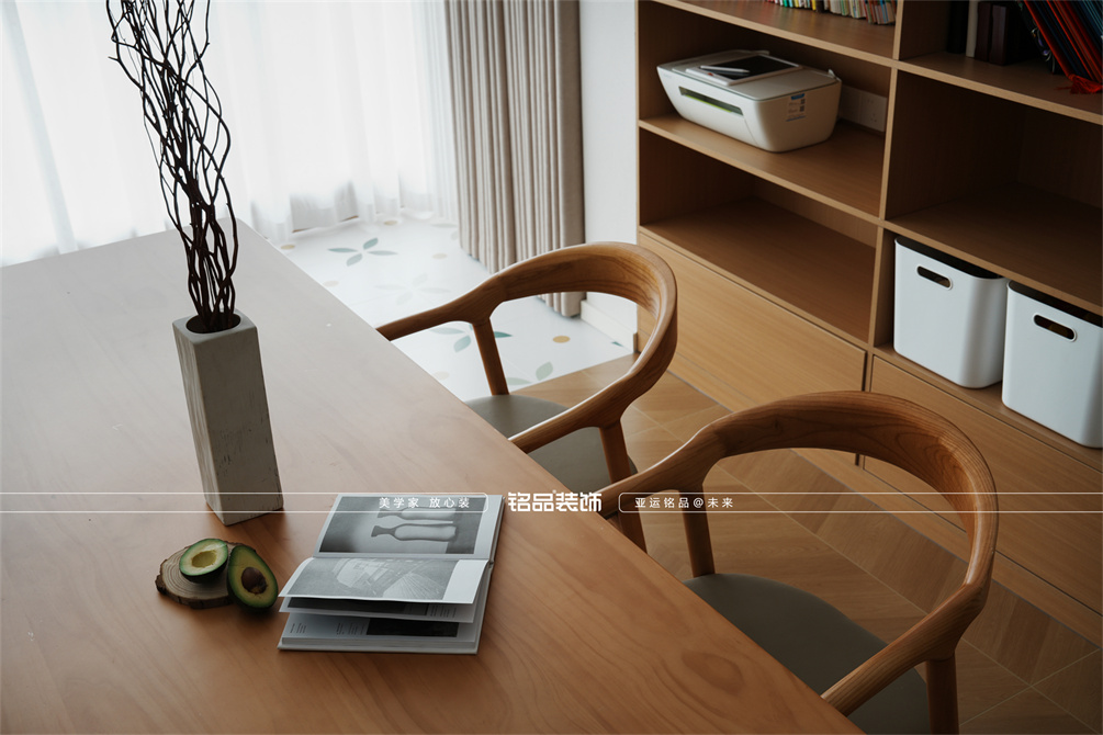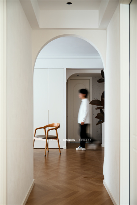 本案以奶油原木风为基调,采用去客厅化的设计,打破传统客厅布局的全新设计理念,重新塑造空间的功能与价值。它摒弃了以电视、沙发、茶几为核心的固定模式,转换成以居住者的实际需求为核心,将客餐厅打造成家庭活动的核心区域,成为一个多功能、灵活且个性化的生活空间,增加了家庭成员之间的互动性,促进沟通与交流,同时兼具了美观性与实用性,通过嵌入式柜体,不同组合的开放式与隐藏式收纳,最大化利用空间,提升空间利用率。这种个性化的设计表达出了业主开朗随和的性格,体现业主积极向上的人生态度和生活方式。