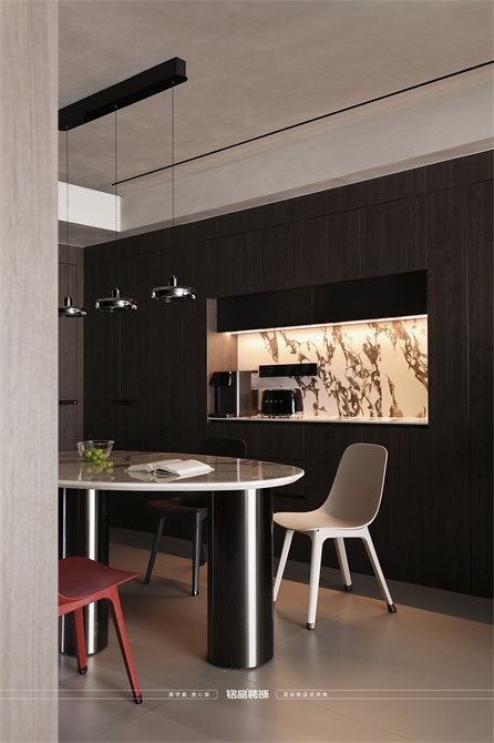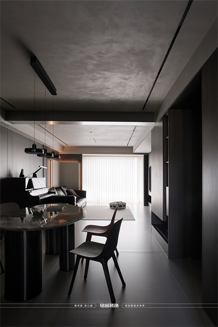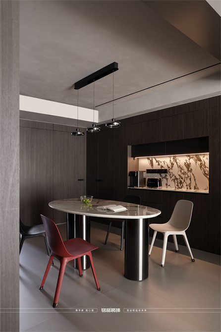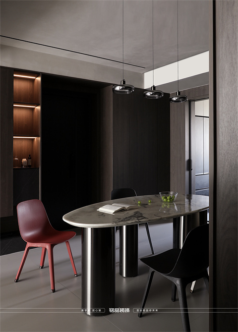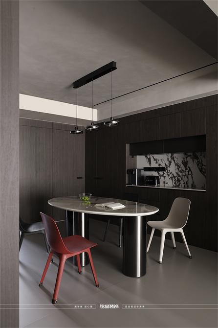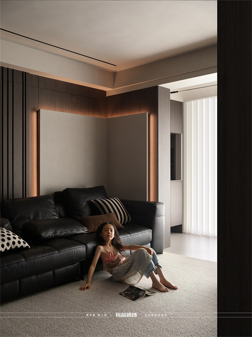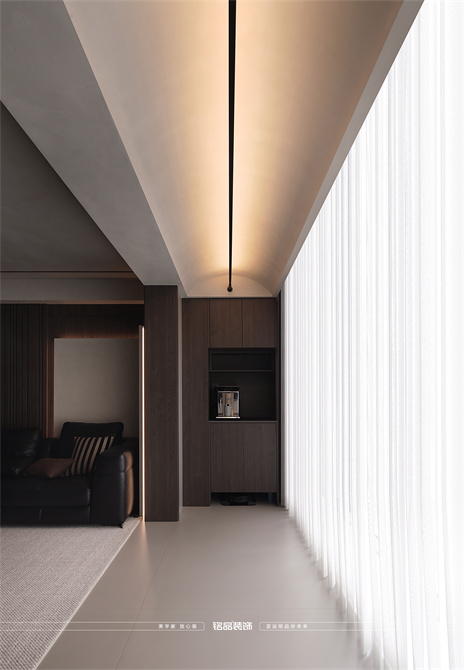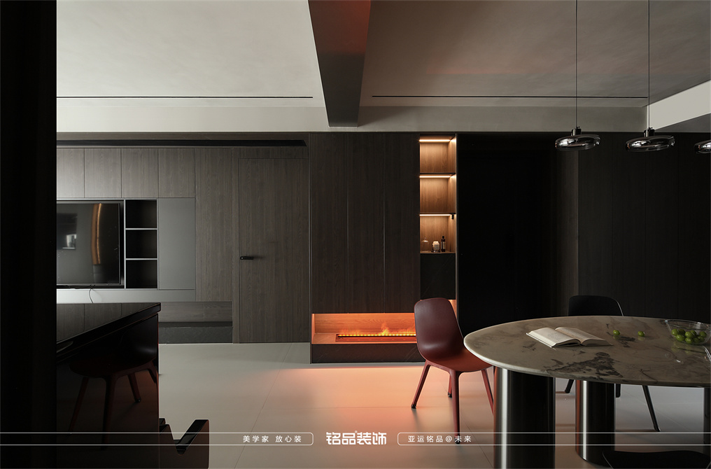 与自然共生 大量使用天然材料:柚木、胡桃木。保留材质的原始纹理。既有复古元素,又带有前瞻性线条,形成复古未来主义。引入自然光:大面积的落地窗、通透的布局,模糊室内外界限。